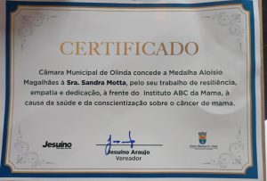 A Câmara Municipal de Olinda agraciou Sandra Motta com a Medalha Aloísio Magalhães, em reconhecimento à sua resiliência, empatia e dedicação à causa da saúde e conscientização sobre o câncer de mama.