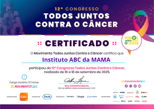 Em setembro de 2025, participamos do **12º Congresso Todos Juntos Contra o Câncer**, de 16 a 18 de setembro, com 27 horas de carga horária. Essa participação fortaleceu nossa rede com especialistas, a ABRALE e o Movimento TJCC, contribuindo para discussões cruciais sobre prevenção e tratamento, com apoio de patrocinadores como GSK, Roche e Ipsen.