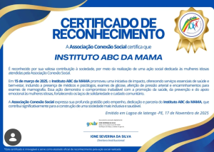 Em novembro de 2025, a Associação Conexão Social emitiu Certificado de Reconhecimento ao instituto por nossa ação social dedicada às mulheres idosas, realizada em 15 de março de 2025, com serviços de saúde, exames e apoio emocional.